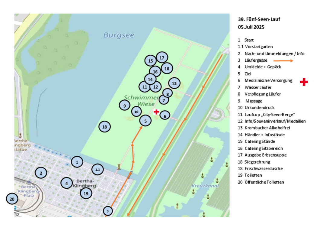 - am Morgen des Lauftages, 4. Juli 2026, am Meldestand auf dem Bertha-Klingberg-Platz (Startort - Lageplan)